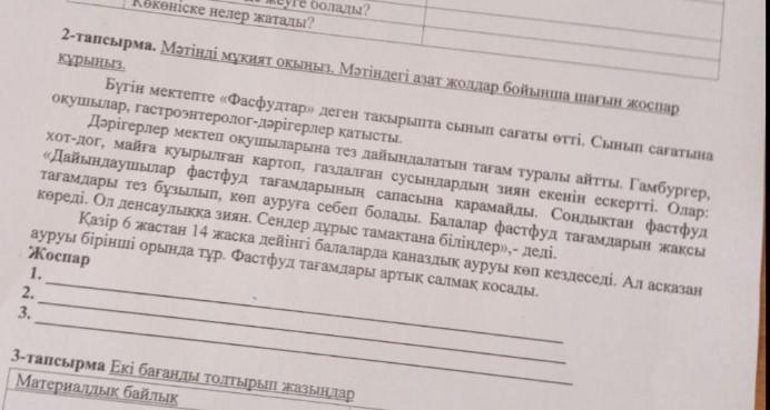 2 - тапсырма . Мәтiндi мукият окыныз . Мәтiндегi азат жолдар бойынша шагын жоспар курыныз . Бүгін мектепте << Фасфудтар >> деген такырыпта сынып сагаты етті . Сынып сагатына окушылар , гастроэнтеролог - дәрiгерлер катысты . Дәрігерлер мектеп окушыларына тез дайындалатын тағам туралы айтты . Гамбургер , хот - дог , майга куырылган картоп , газдалган сусындардын зиян екенін ескертті . Олар : << Дайындаушылар фастфуд тағамдарының сапасына карамайды . Сондыктан фастфуд тагамдары тез бұзылып , кеп ауруға себеп болады . Балалар фастфуд тагамдарын жаксы көреді . Ол денсаулыкка зиян . Сендер дұрыс тамактана бiлiндер » , - деді . Казiр 6 жастан 14 жаска дейiнгi балаларда каназдык ауруы көп кездеседi . Ал асказан ауруы бiрiншi орында тұр . Фастфуд тагамдары артык салмак косады .