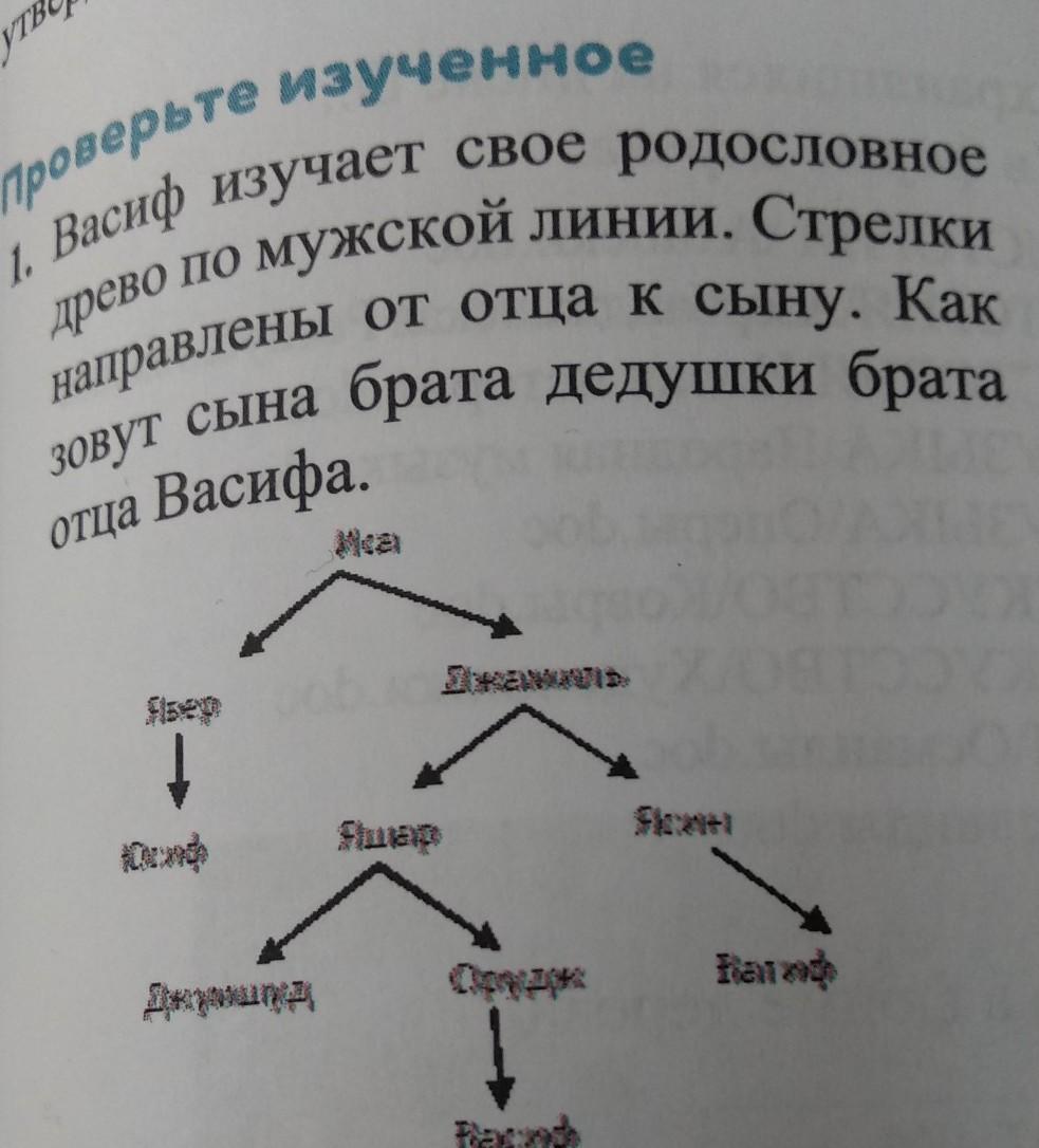 Проверьте изученное 1. Васиф изучает свое родословное древо по мужской линии. Стрелки направлены от отца к сыну. Как зовут сына брата дедушки брата отца Васифа. са ! end Pup Sknet ДешA Band