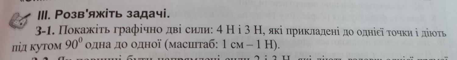 3-1. Покажіть графічно дві сили: 4 H i 3 H, які прикладені до однієї точки і діють під кутом 90° одна до одної (масштаб: 1 см - 1 H).