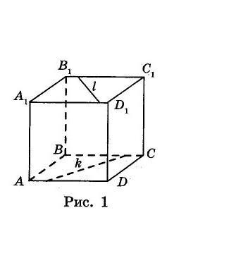 На рис. 1 зображений куб ABCDA1B1C1D1 . Відстань між прямими l i k дорівнює 4 см. Знайдіть об'єм куба.