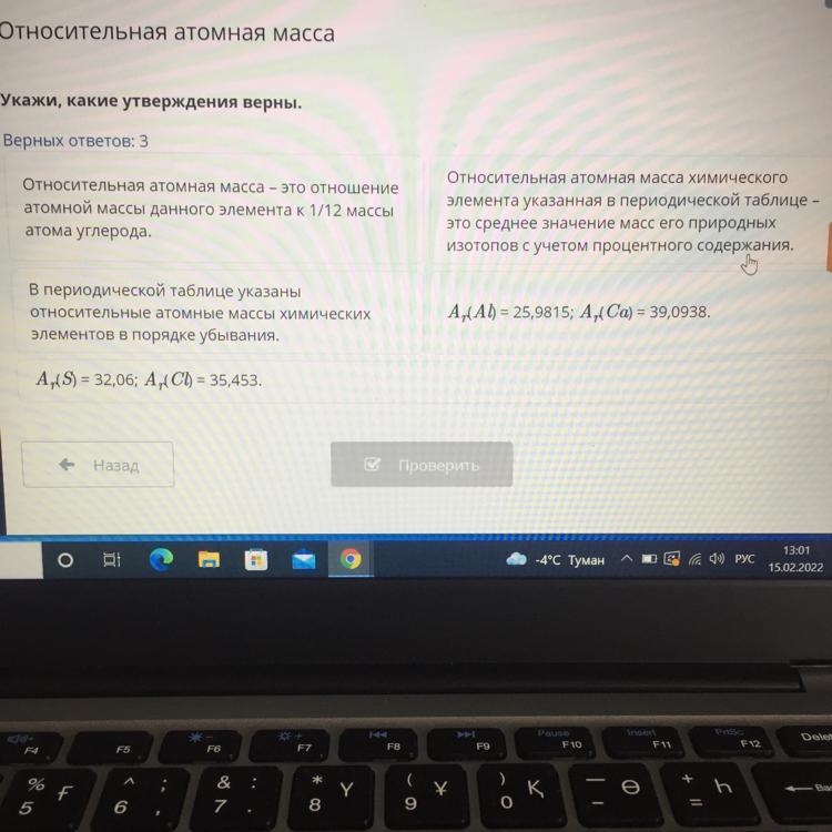 Относительная атомная масса Укажи, какие утверждения верны. Верных ответов: 3 Относительная атомная масса химического элемента указанная в периодической таблице – это среднее значение масс его природных изотопов с учетом процентного содержания. Ar(Al) = 25,9815; Ar(Ca) = 39,0938. Относительная атомная масса – это отношение атомной массы данного элемента к 1/12 массы атома углерода. В периодической таблице указаны относительные атомные массы химических элементов в порядке убывания. Ar(S) = 32,06; Ar(Cl) = 35,453. Важно знать! Относительная атомная масса – это отношение массы атома к атомной единице массы. Объяснение В периодической таблице рядом с соответствующим элементом указано среднее значение относительной атомной массы. Рассчитывается оно путем нахождения среднего значения всех природных изотопов с учетом их содержания в природе. С увеличением порядкового номера это значение увеличивается. За относительную атомную массу принимается отношение атомной массы данного элемента к 1/12 массы атома углерода. Например, Ar(S) = 32,06; Ar(Cl) = 35,453; Ar(Al) = 26,9815; Ar(Ca) = 40,08.