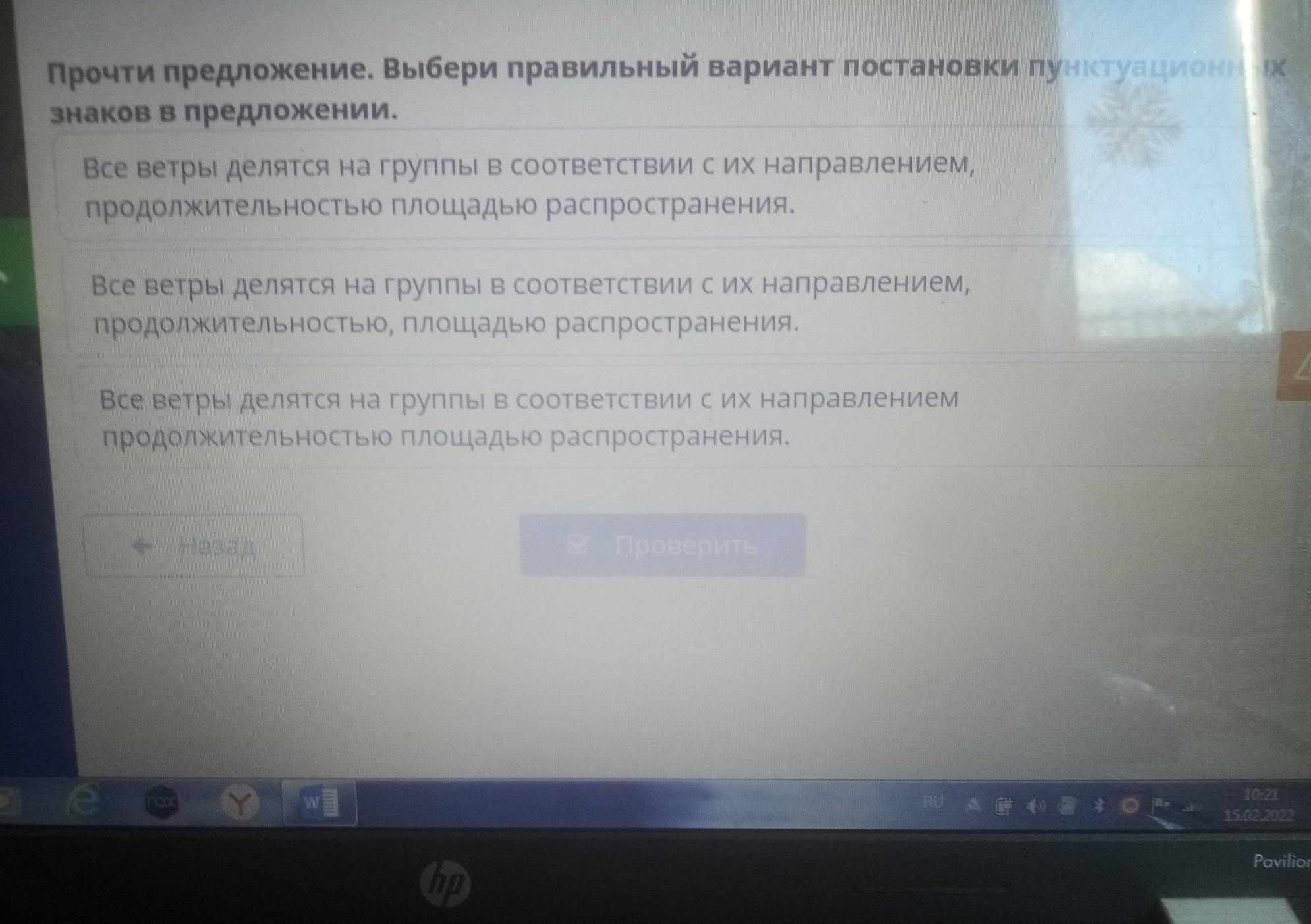 Прочти предложение. Выбери правильный вариант постановки пунктуационных знаков в предложении. Все ветры делятся на группы в соответствии с их направлением, продолжительностью площадью распространения. а Все ветры делятся на группы в соответствии с их направлением, продолжительностью, площадью распространения. нение А Тие Все ветры делятся на группы в соответствии с их направлением продолжительностью площадью распространения