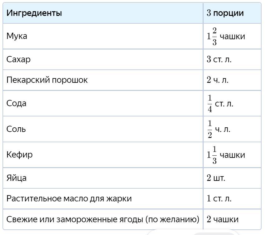 Лена планирует пригласить на Масленицу своих подруг и уже скорректировала рецепт кефирных оладий, чтобы получилось нужное количество порций. Однако, нацелясь на достижение наилучшего результата, Лена решила высчитать всё до грамма.