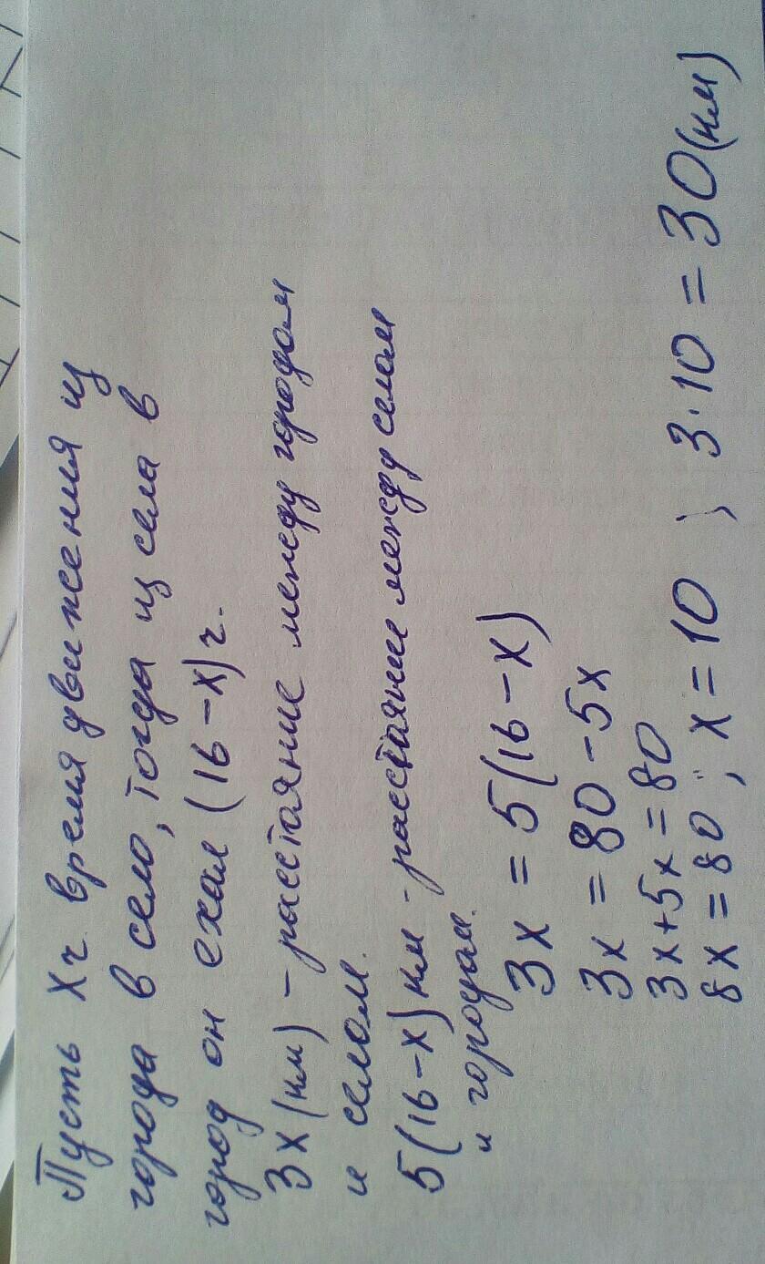Велосипедист ехал из города в село со скоростью 3 км/ч, а возвращался со скоростью 5 км/ч. Найдите расстояние между селом и городом, если на весь путь он затратил 16ч? СРОЧНО ПОЖАЛУЙСТА