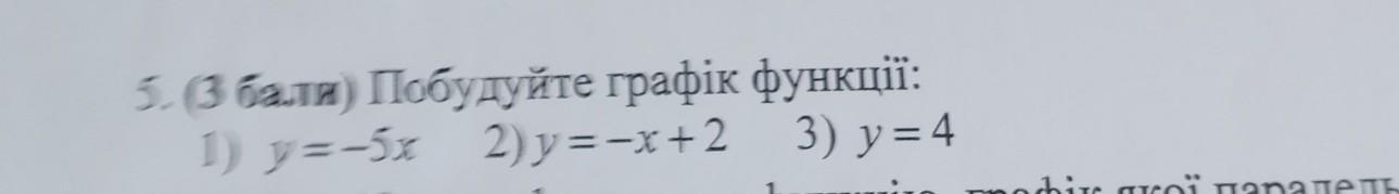 5. (3 бали) Побудуйте графік функції: 1) y=-5x 2) y =-x+2 у 3) y = 4 фшкцію графік я