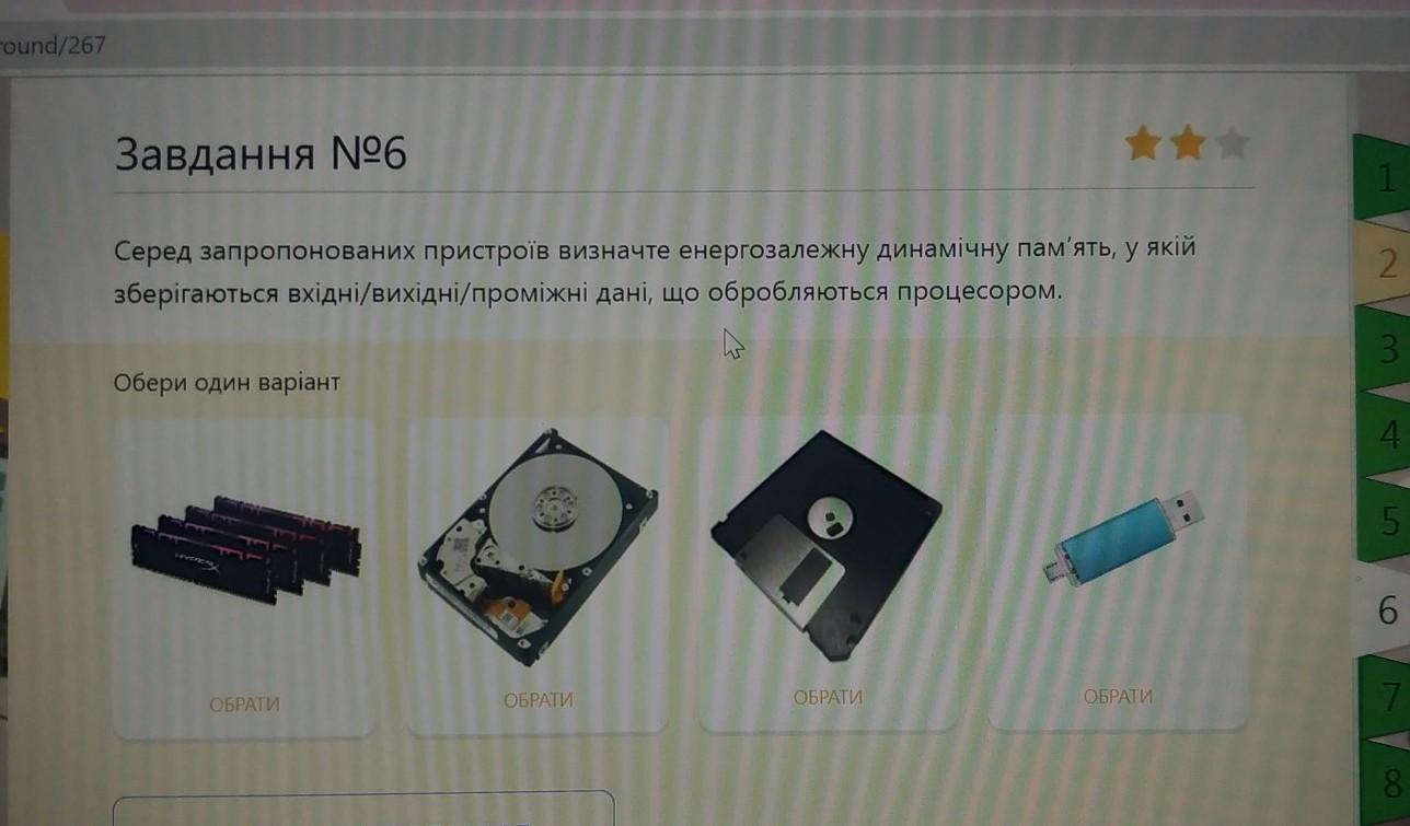 Завдання No6 Серед запропонованих пристроїв визначте енергозалежну динамічну пам'ять, у якій зберігаються вхідні/вихідні/проміжні дані, що обробляються процесором. Обери один варіант ОБРАТИ ОБРАТИ ОБРАТИ ОБРАТИ