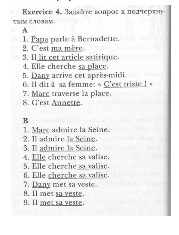 СРОЧНОООО ДАМ 50 БАЛЛОВExercice 4. Задайте вопрос к подчеркну тым словам. A 1. Papa parle à Bernadette. 2. C'est ma mère. 3. Il lit cet article satirique. 4. Elle cherche sa place. 5. Dany arrive cet après-midi. 6. Il dit à sa femme: « C'est triste ! » 7. Marc traverse la place. 8. C'est Annette. B 1. Marc admire la Seine. 2. Il admire la Seine. 3. Il admire la Seine. 4. Elle cherche sa valise. 5. Elle cherche sa valise. 6. Elle cherche sa valise. 7. Dany met sa veste. 8. Il met sa veste. 9. Il met sa veste.