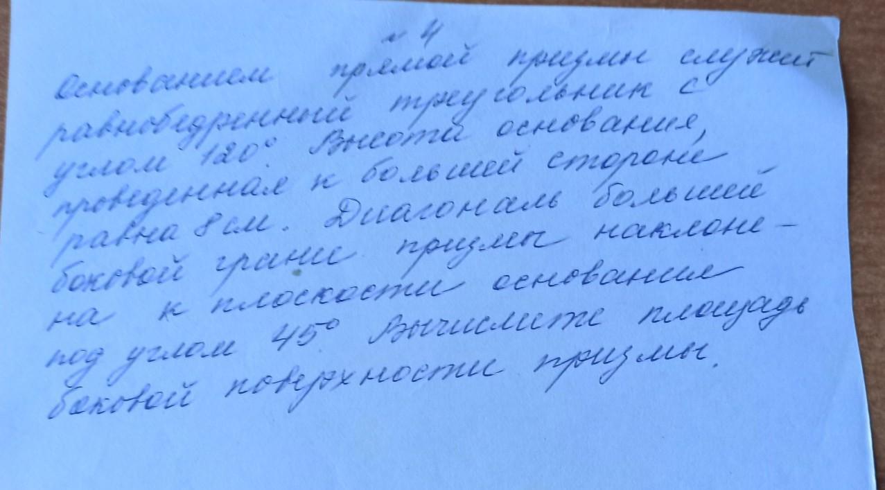 Основание прямой призмы служит равнобедренный треугольник с углом 120⁰.Высота основания,проведённая к большей стороне,равна 8см.Диагональ большей боковой грани призмы наклонена к плоскости основания под углом 45⁰.Вычислите площадь боковой поверхности призмы.