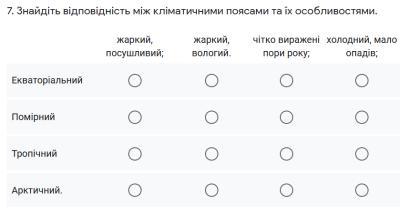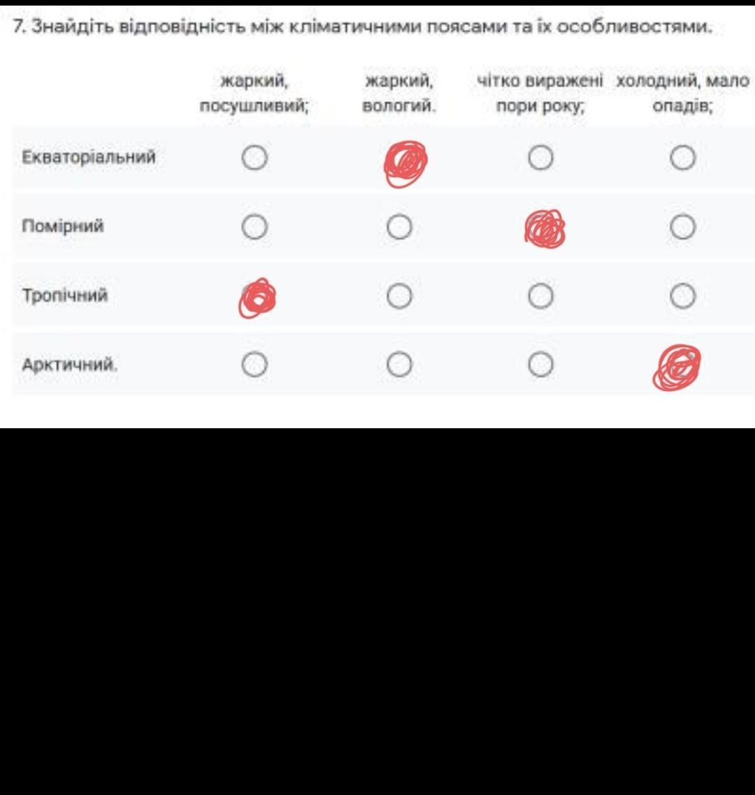 Ответ: Экваториальный - жаркий,влажный. Умеренный - ярко выраженные времена года. Тропический - жаркий, засушливый. Арктический - холодный, мало осадков