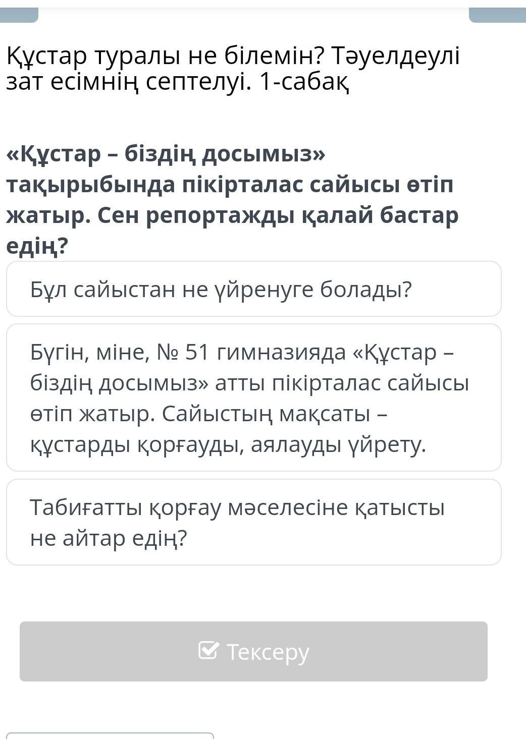 «Құстар быздын досымыз»тақырыбында пікірталас сайысы өтып жатыр.Сен репортажды қалай бастар едің?