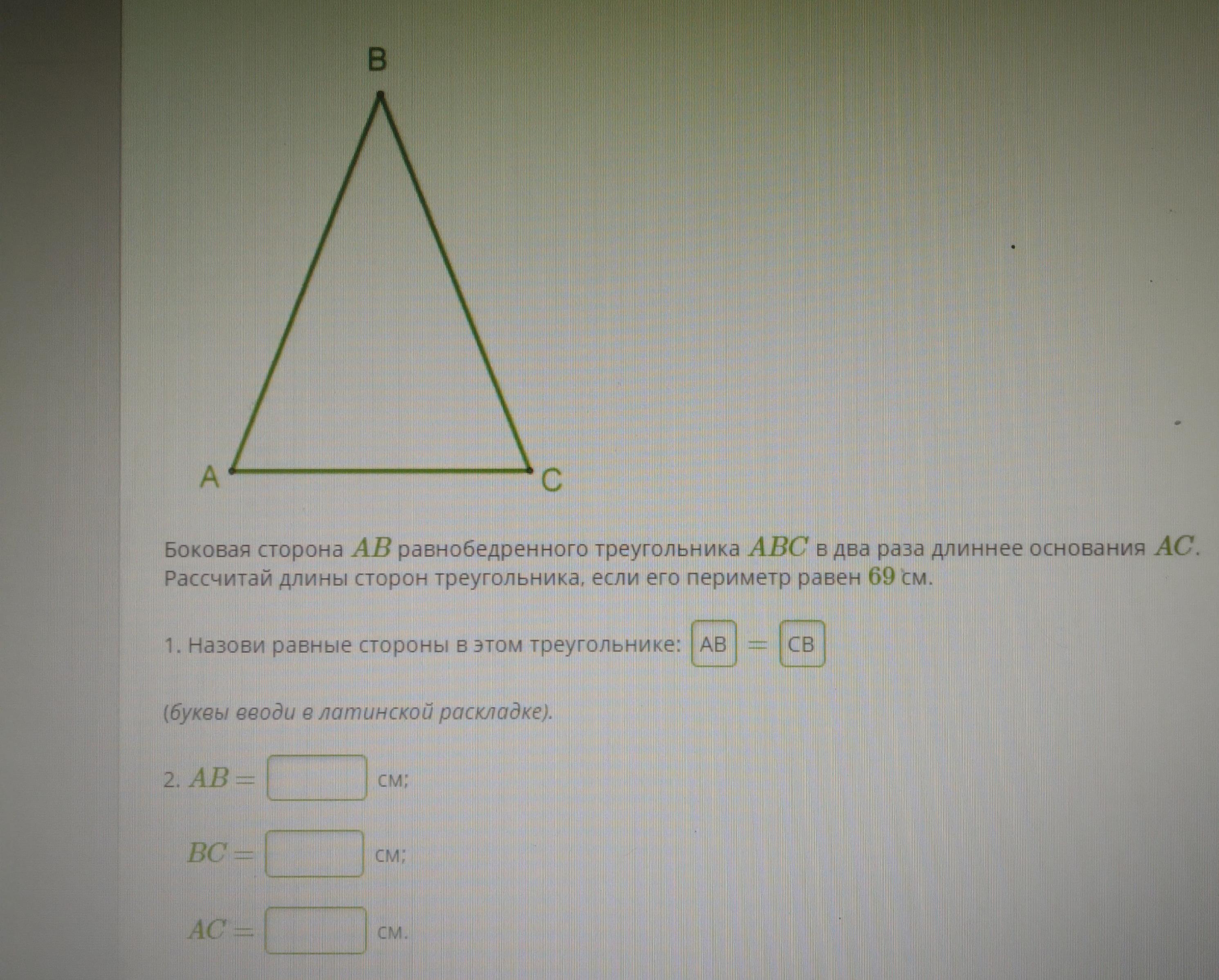 боковая сторона ab равнобедренного треугольника abc в 2 раза длиннее основания ac рассчитайте длины сторон треугольника если его периметр равен 69 см