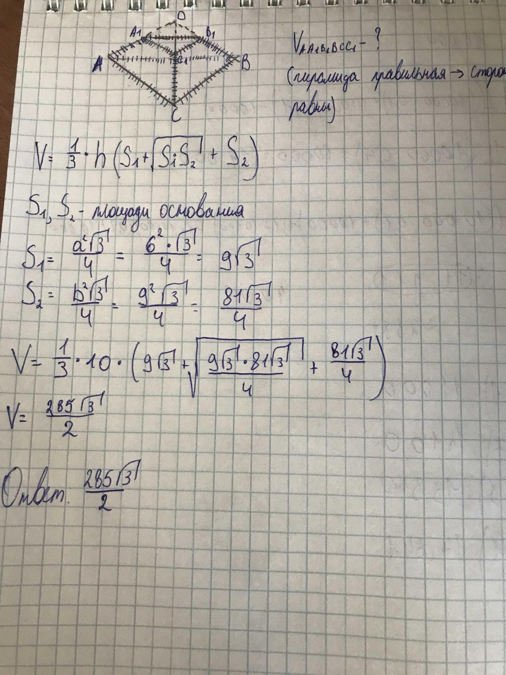 Найдите объём правильной треугольной усечённой пирамиды стороны оснований которой равны 6 см и 9 см а высота 10