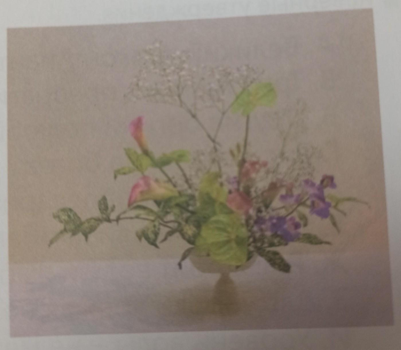 рассмотрите иллюстрацию. Опишите ее устно. При описании обратите внимание на цвет, форму, размер икебаны. Опишите свои чувства