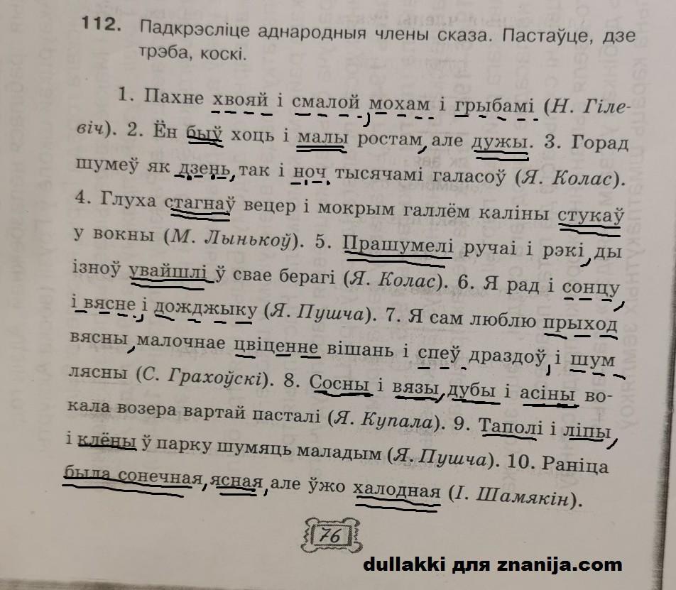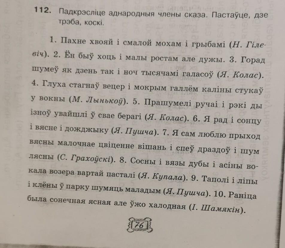 112. Падкрэсліце аднародныя члены сказа. Пастаўце, дзе трэба, коскі.