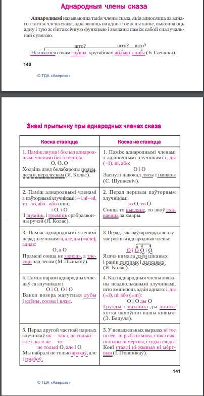 1. Пахне хвояй і смалой, мохам і грыбамі (Н. Гілевіч). 2. Ён быў хоць і малы ростам, але дужы. 3. Горад шумеў як дзень, так і ноч тысячамі галасоў (Я. Колас). 4. Глуха стагнаў вецер і мокрым галлём каліны стукаў у вокны (М. .Пынькоў). 5. Прашумелі ручаі і рэкі, ды ізноў увайшлі ў свае берагі (Я. Колас). 6. Я рад і сонцу, і вясне, і дожджыку (Я. Пушча). 7. Я сам люблю прыход вясны, малочнае цвіценне вішань і спеў драздоў, і шум лясны (С. Грахоўскі). 8. Сосны і вязы, дубы і асіны вокала возера вартай пасталі (Я. Kyпалa). 9. Таполі і ліпы, і клёны ў парку шумяць маладым (Я. Пушча). 10. Раніца была сонечная, ясная, але ўжо халодная (І Шамякін).