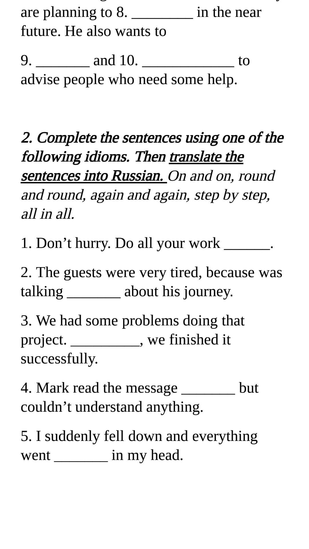 1-step by step. 2-on and on. 3-all in all. 4-again and again. 5-round and round.