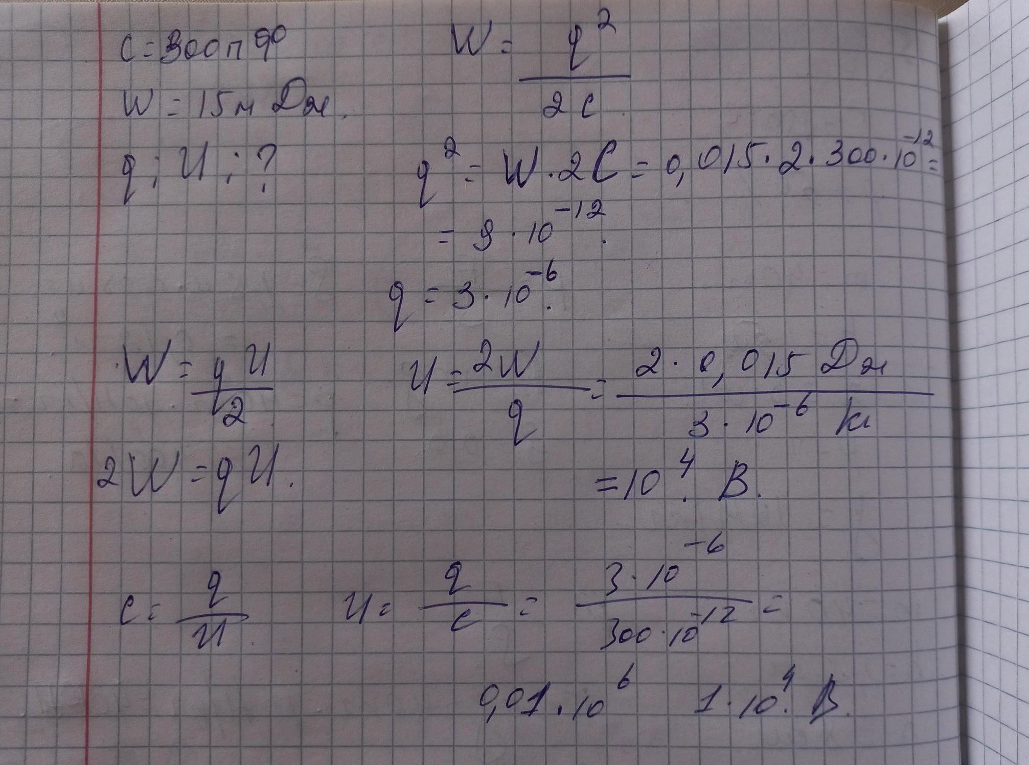 4. Энергия электрического поля конденсатора электроёмкостью 300 пф равна 15 мДж. Определите заряд конденсатора и напряжение между его обкладками.