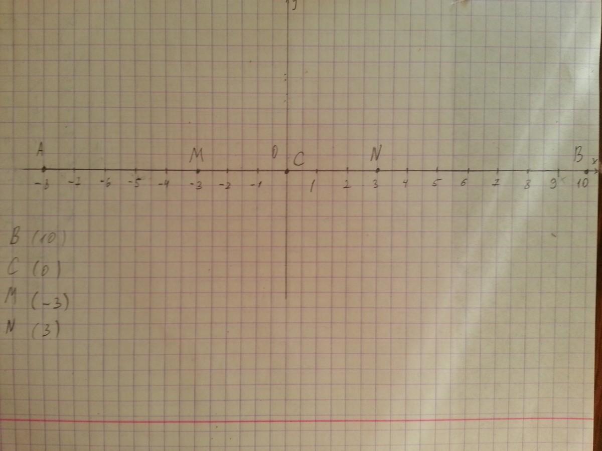 Отметьте на координатной прямой точку А (–2), приняв за единичный отрезок длину трех клеток. Отметьте на этой прямой точки В, С, М и N, если М левее точки А на 2 клетки, N – правее точки А на 8 клеток, С – середина отрезка MN, а точка В правее точки С на 9 клеток. Найдите координаты точек В, С, М и N.