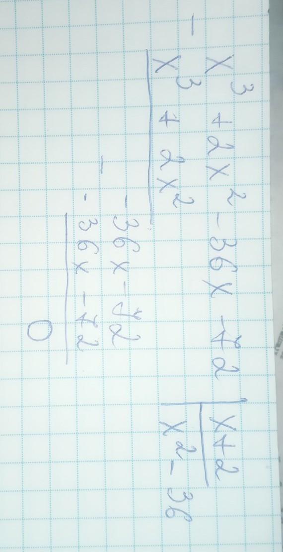 значит мы нашли один корень х=-2 теперь нужно разложить выражение на множители один с которых х+2 для этого поделим (х³+2х²-36х-72) на (х+2)=х²-36(на фото)