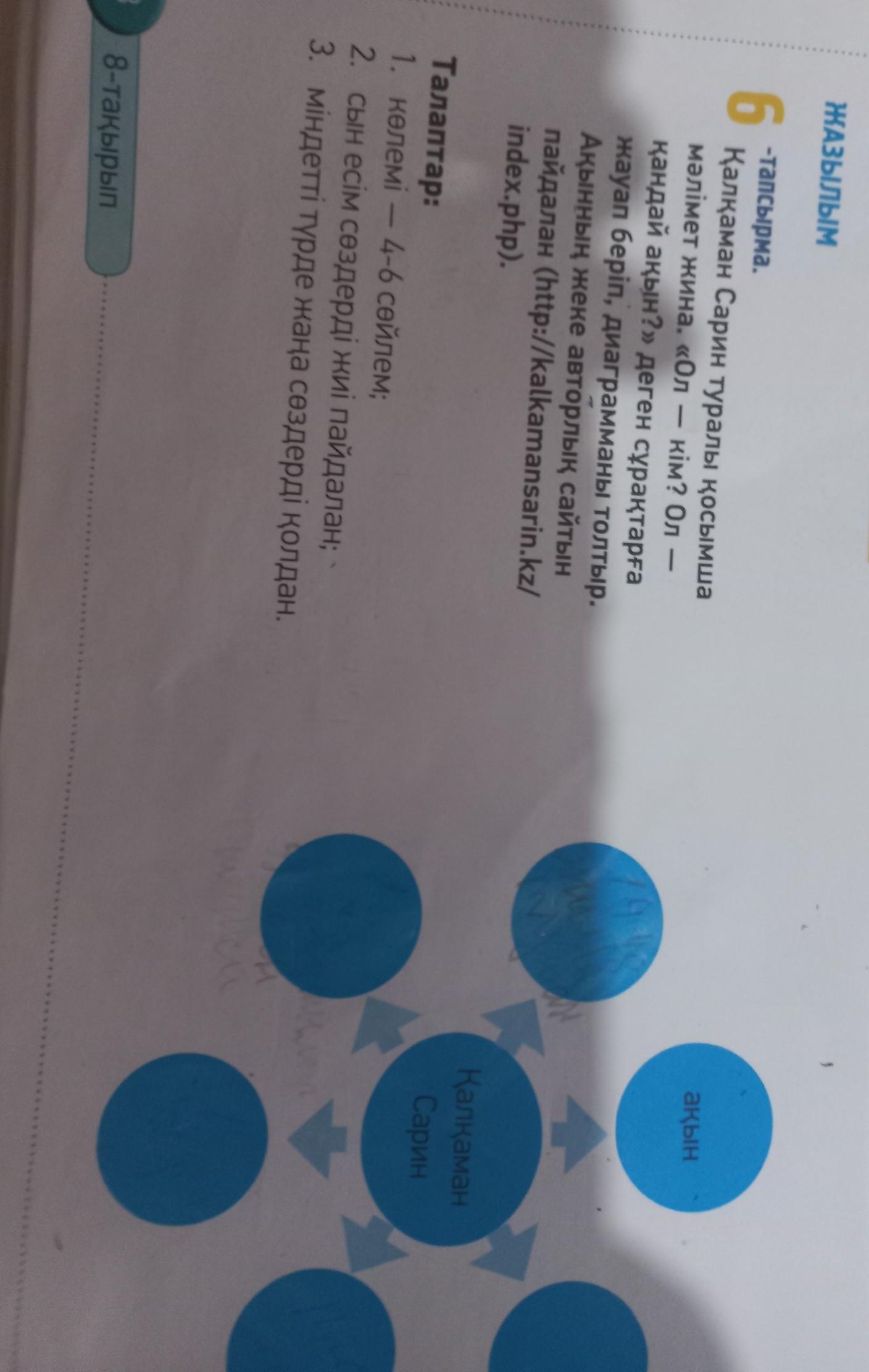 6тапсырма Қалқаман Сарин ақын,жазушы.Ол балаларға арнап көптеген өлең шығармалар жазып,өзңнің өмір соңындағы өмірбаянын жазған.Ол қазақтан шыққан қазақ ақыны.1890 жылы дүниеге келген