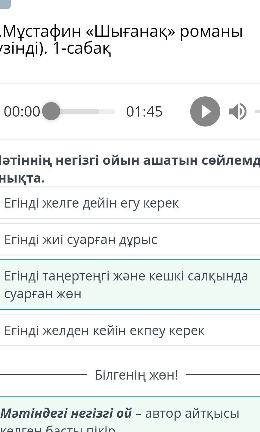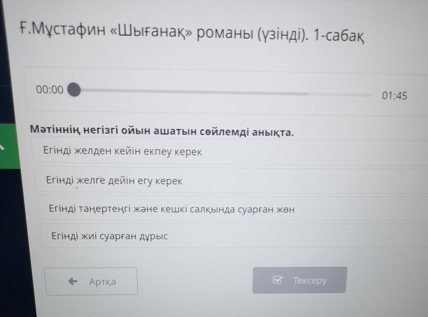 СРОЧНООООО Ғ.Мұстафин «Шығанақ» романы (үзінді). 1-сабақ 00:00 01:45 Мәтіннің негізгі ойын ашатын сөйлемді анықта. Егінді желден кейін екпеу керек Егінді желге дейін егу керек ET Егінді таңертеңгі және кешкі салқында суарған жөн Егінді жиі суарған дұрыс Тексеру е Артқа