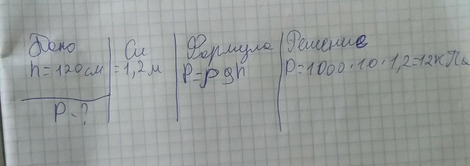 Р=ρgh=1000*10*1,2=12000Па=12кПа
