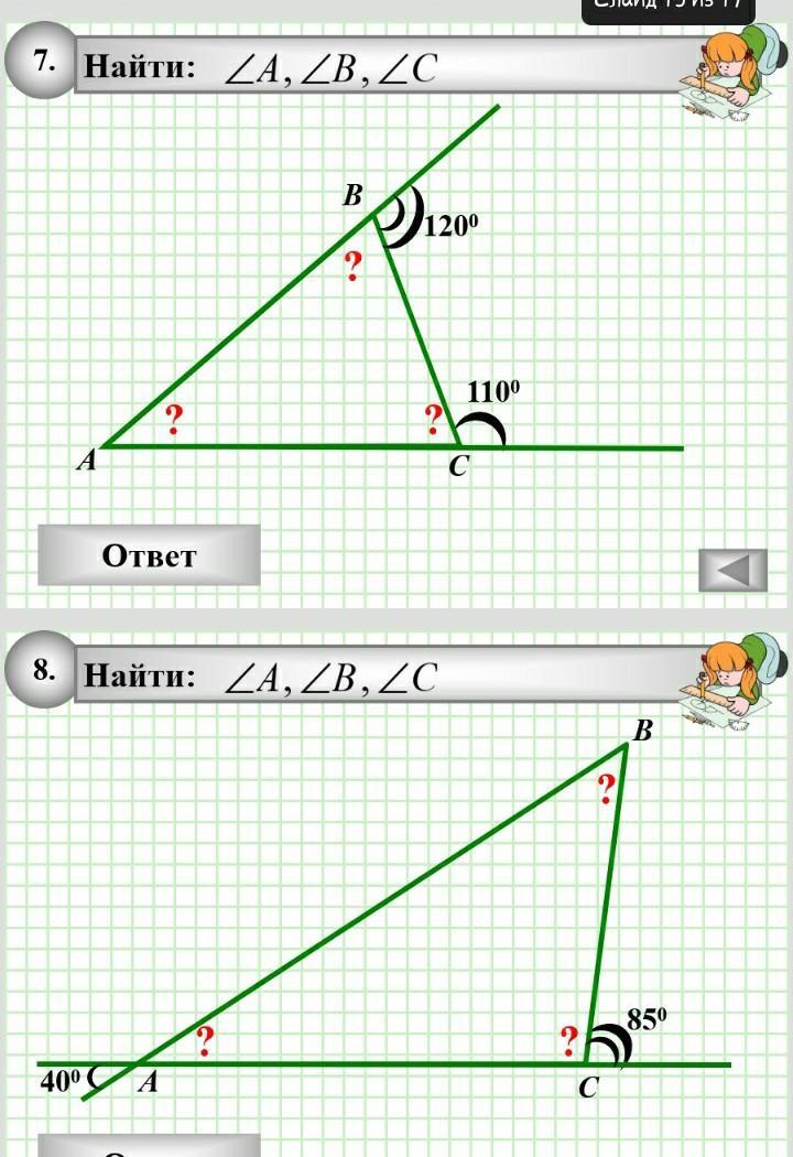 1)В первой задаче там по смежности находим углы, угол B=180°-120°=60°