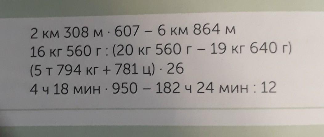 2 км 308 м. 607 - 6 км 864 м 16 кг 560 г: (20 кг 560 г- 19 кг 640 г) (5 т 794 кг + 781 ц) - 26 . 4 ч 18 мин. 950 - 182 ч 24 мин: 12