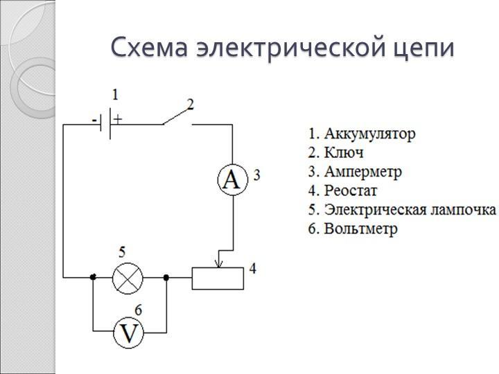 5.Нарисуйте схему цепи из гальванического элемента, лампочки, ключа, амперметра, реостата. Покажите направление тока в цепи и через реостат.