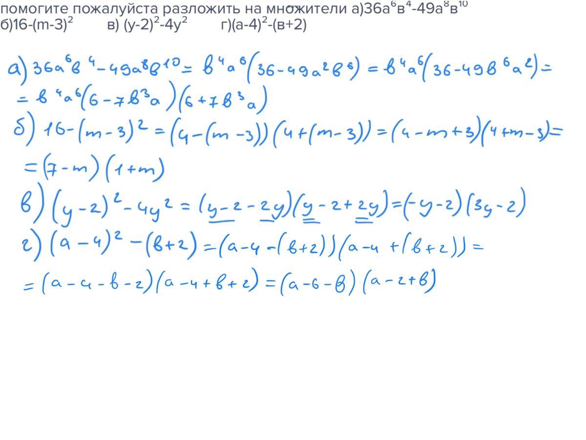 помогите пожалуйста разложить на множители а)36а⁶в⁴-49а⁸в¹⁰ б)16-(m-3)² в) (у-2)²-4у² г)(а-4)²-(в+2)