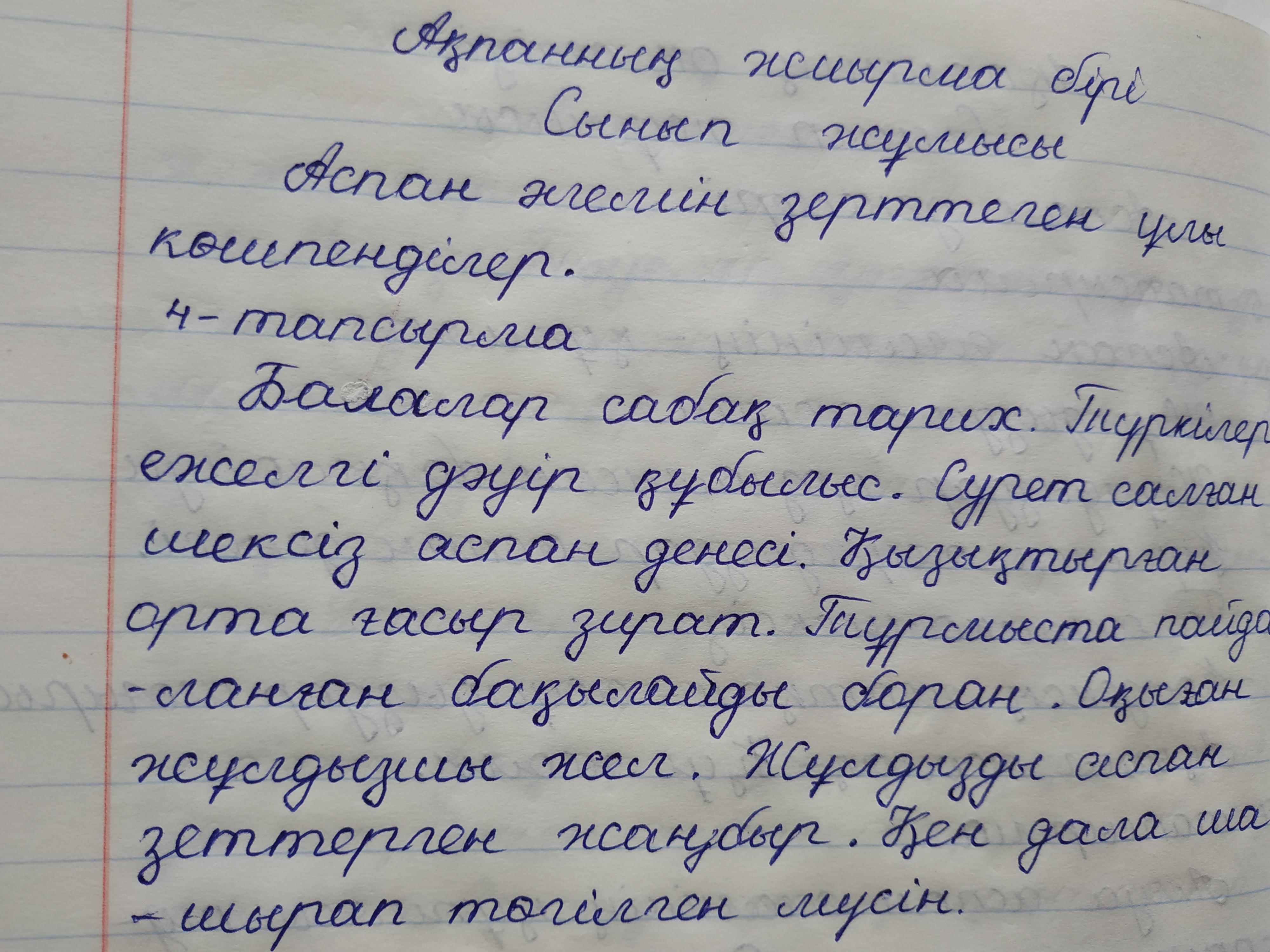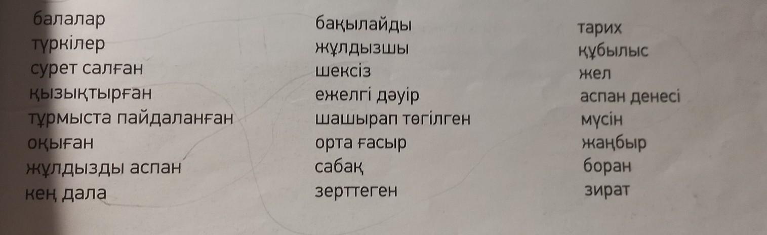 ЖАЗЫЛЫМ 4-тапсырма. . 4 Әр қатардағы жаңа сөзді тауып, сөз тіркесін құр. балалар түркілер сурет салған қызықтырған тұрмыста пайдаланған Оқыған жұлдызды аспан кең дала бақылайды жұлдызшы шексіз ежелгі дәуір шашырап төгілген орта ғасыр сабақ зерттеген тарих құбылыс жел аспан денесі мүсін жаңбыр боран зират