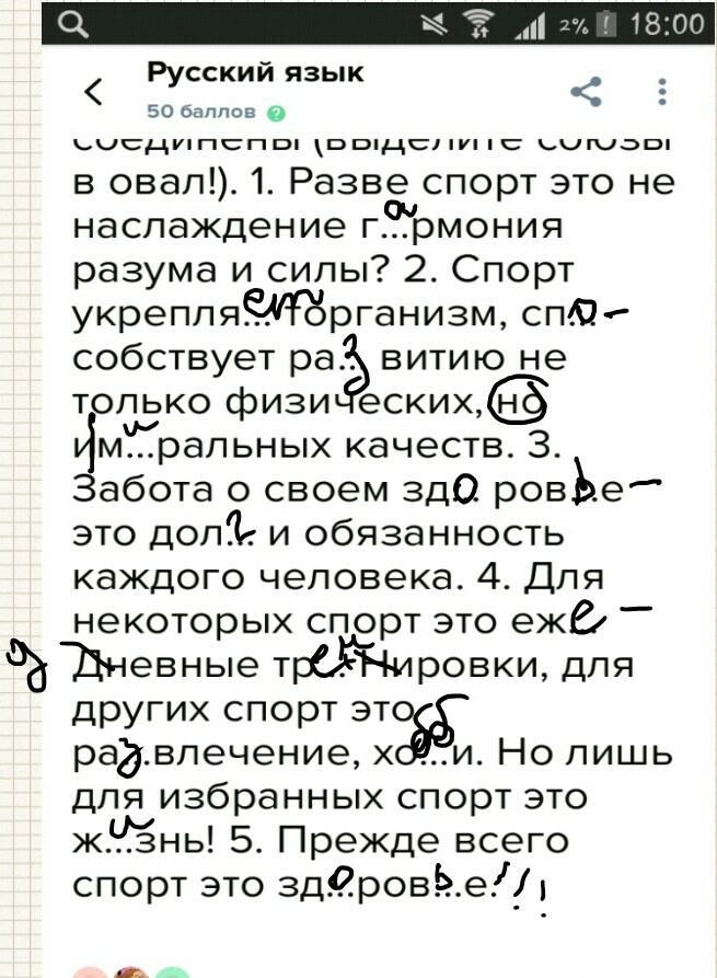 1)Спиши предложения, вставляя пропущенные буквы и расставляя недостающие знаки препинания (тире, запятые). 2)Подчеркни однородные члены предложения. Укажи союзы, которыми они соединены (выделите союзы в овал!). 1. Разве спорт это не наслаждение г...рмония разума и силы? 2. Cпорт укрепля... торганизм, сп... собствует ра... витию не только физических, но им...ральных качеств. 3. Забота о своем зд... ров...е это дол... и обязанность каждого человека. 4. Для некоторых спорт это еж... Дневные тр... Нировки, для других спорт это ра...влечение, хо...и. Но лишь для избранных спорт это ж...знь! 5. Прежде всего спорт это зд...ров...е.