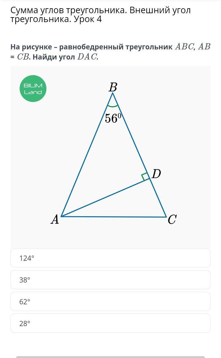 56 + 2α = 180 (теорема о сумме углов треугольника)