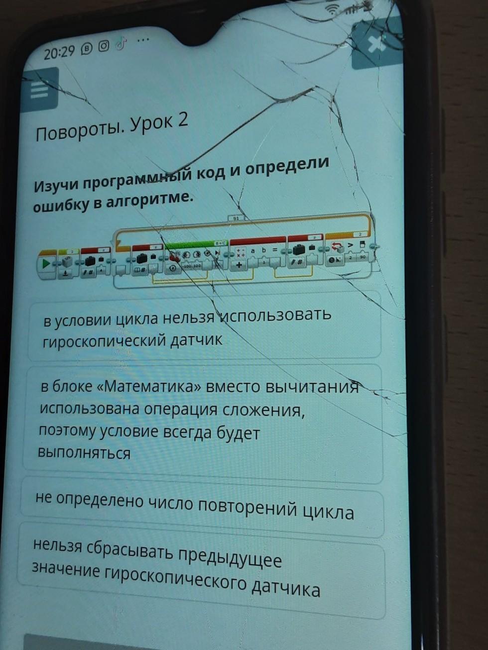 Повороты. Урок 2 Изучи программный код и определи ошибку в алгоритме. хоолоо в условии цикла нельзя использовать гироскопический датчик в блоке «Математика» вместо Вычитания использована операция сложения, поэтому условие всегда будет выполняться не определено число повторений цикла нельзя сбрасывать предыдущее значение гироскопического датчика ПРОШУ ДАМ 30 БАЛЛОВГОСПАДИ КТО НИБУДЬ ПОМОГИТЕЕЕЕ УЖЕЕЕ