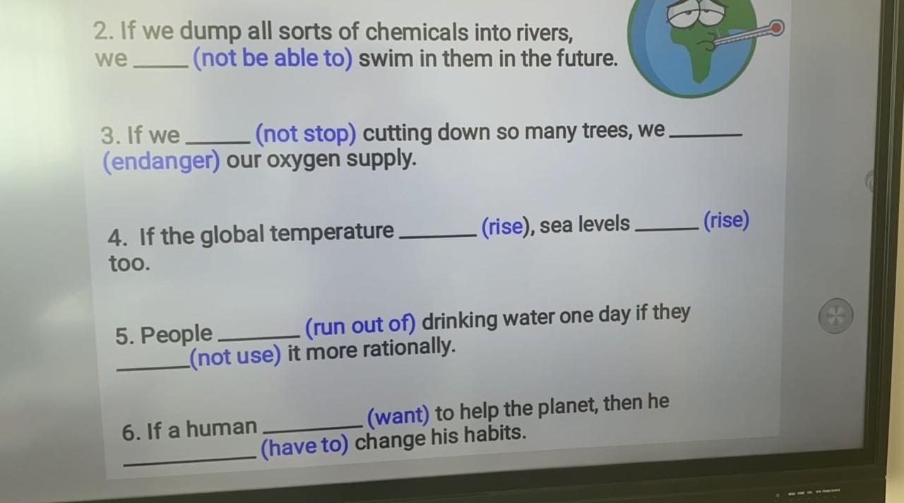 Ответ:2. If we dump all sorts of chemicals into rivers, we will not be able to swim in them in the future.3. If we do not stop cutting down so many trees, we will be endangered our oxygen supply4. If the global temperature rises, sea levels will rise too.5.People will run out of drinking water one day if they do not use it more rationally