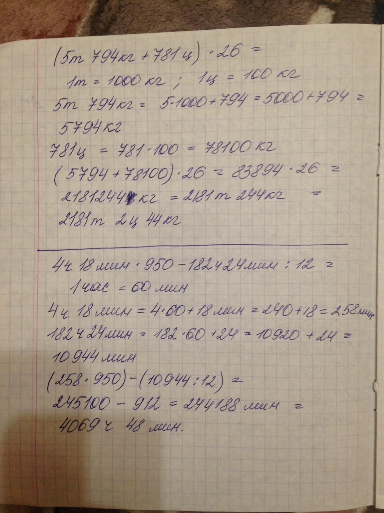 4 ч 18 мин * 950 - 182 ч 24 мин : 12 = 258 мин * 950 - 10 944 мин : 12 =