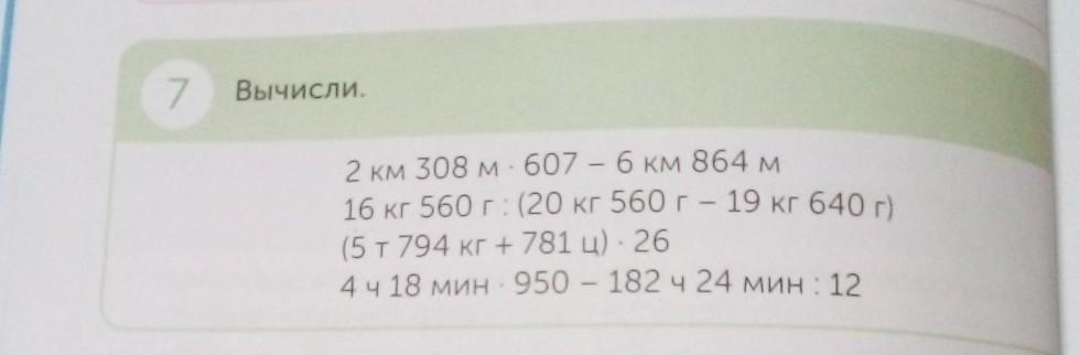Вычисли. 2 км 308 м 607 – 6 км 864 м 16 кг 560 г (20 кг 560 г — 19 кг 640 г) (5т 794 кг + 781 ц) - 26 4 ч 18 мин 950 — 182 ч 24 мин 12 -