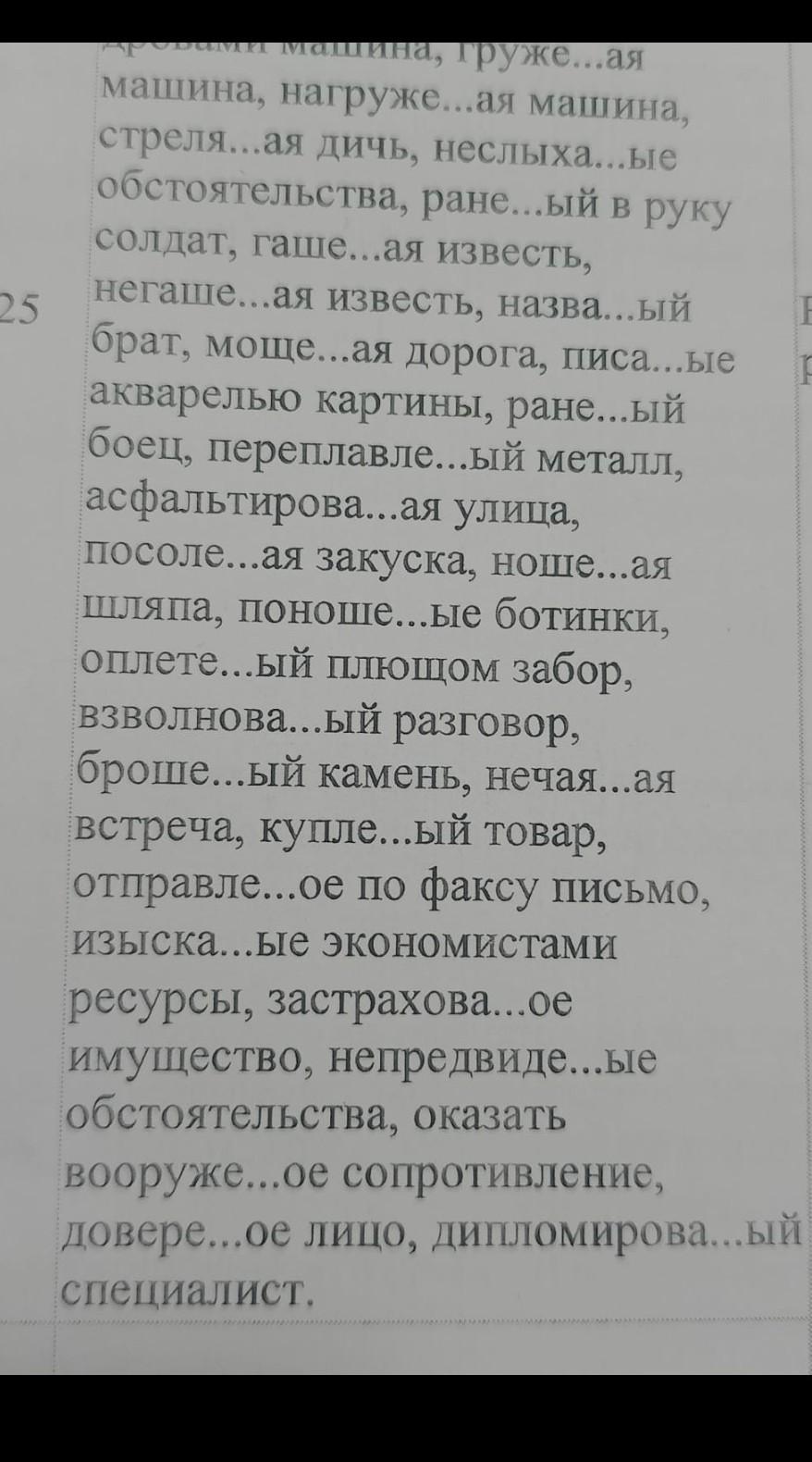 гружёная машина, нагруженная машина, стреляная дичь, неслыханные обстоятельства, раненный в руку солдат, гашеная известь, негашёная известь, названый брат, мощёная дорога, писанные акварелью картины, раненый боец, переплавленный металл, асфальтированная улица, посолёная закуска, ношеная шляпа, поношенные ботинки, оплетенные плющом, взволнованный разговор, Брошенный камень, купленный товар, нечаянная встреча, отправленное по факсу письмо, изысканные экономистами ресурсы, застрахованное имущество, непредвиденные обстоятельства, оказать вооруженное сопротивление, доверенное лицо, дипломированный специалист
