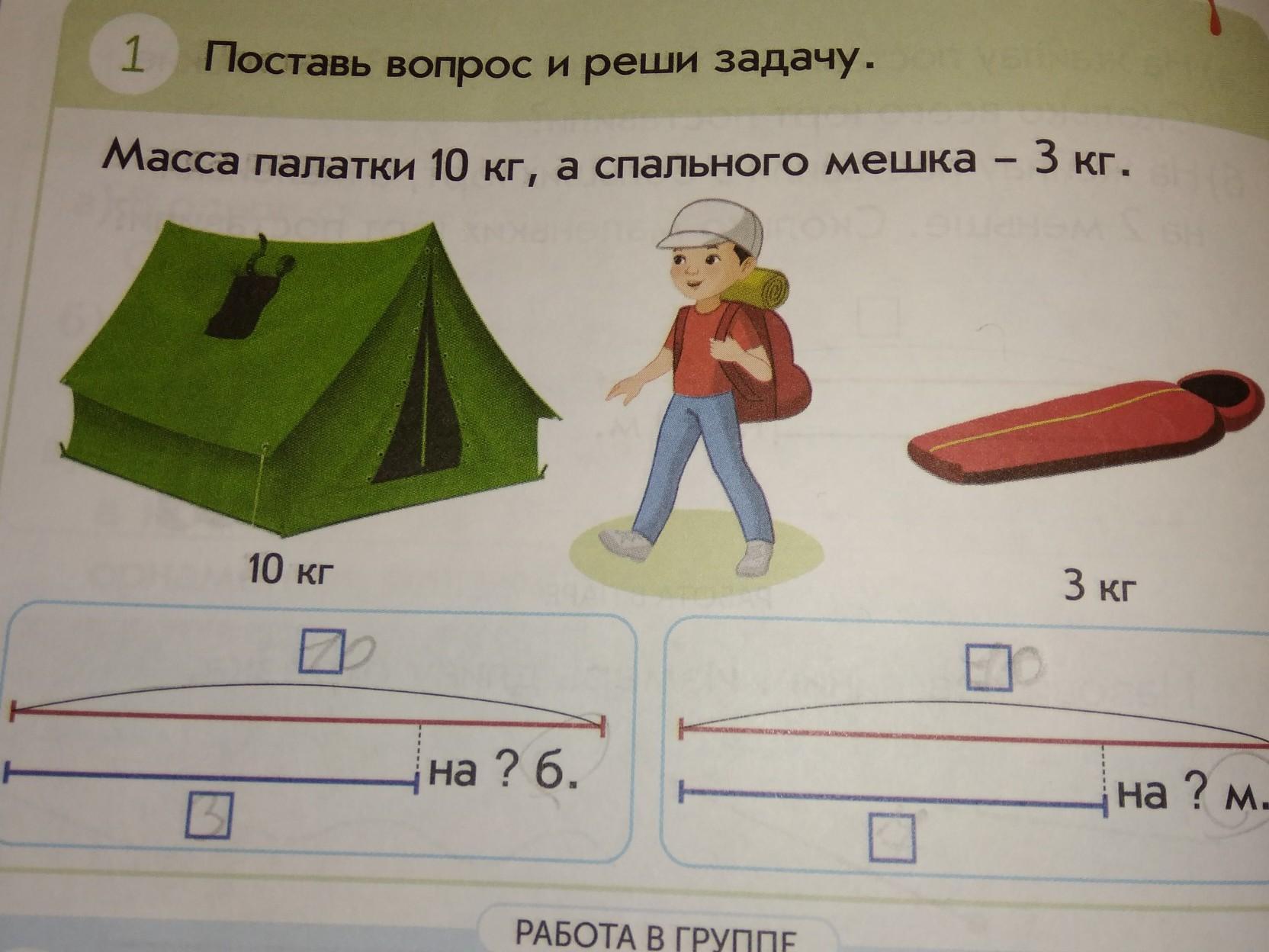 1) 10-3=7(кг)-на 7 (кг) меньше палатки спальный мешок