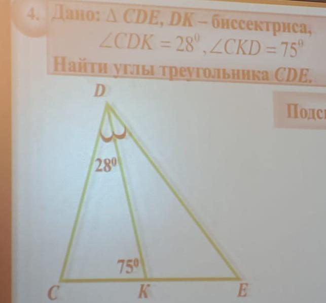 2) <CDE = <CDK × 2 = 28⁰ × 2 = 56⁰ (биссектриса делит угол попалам)