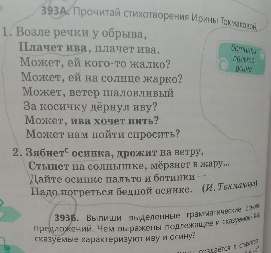 Надо не 393Б. Выпиши выделенные грамматические основы предложений. Чем выражены подлежащее и сказуемое? Как сказуемые характеризуют иву и осину? осны создаётся в стихотво- пӧнные?