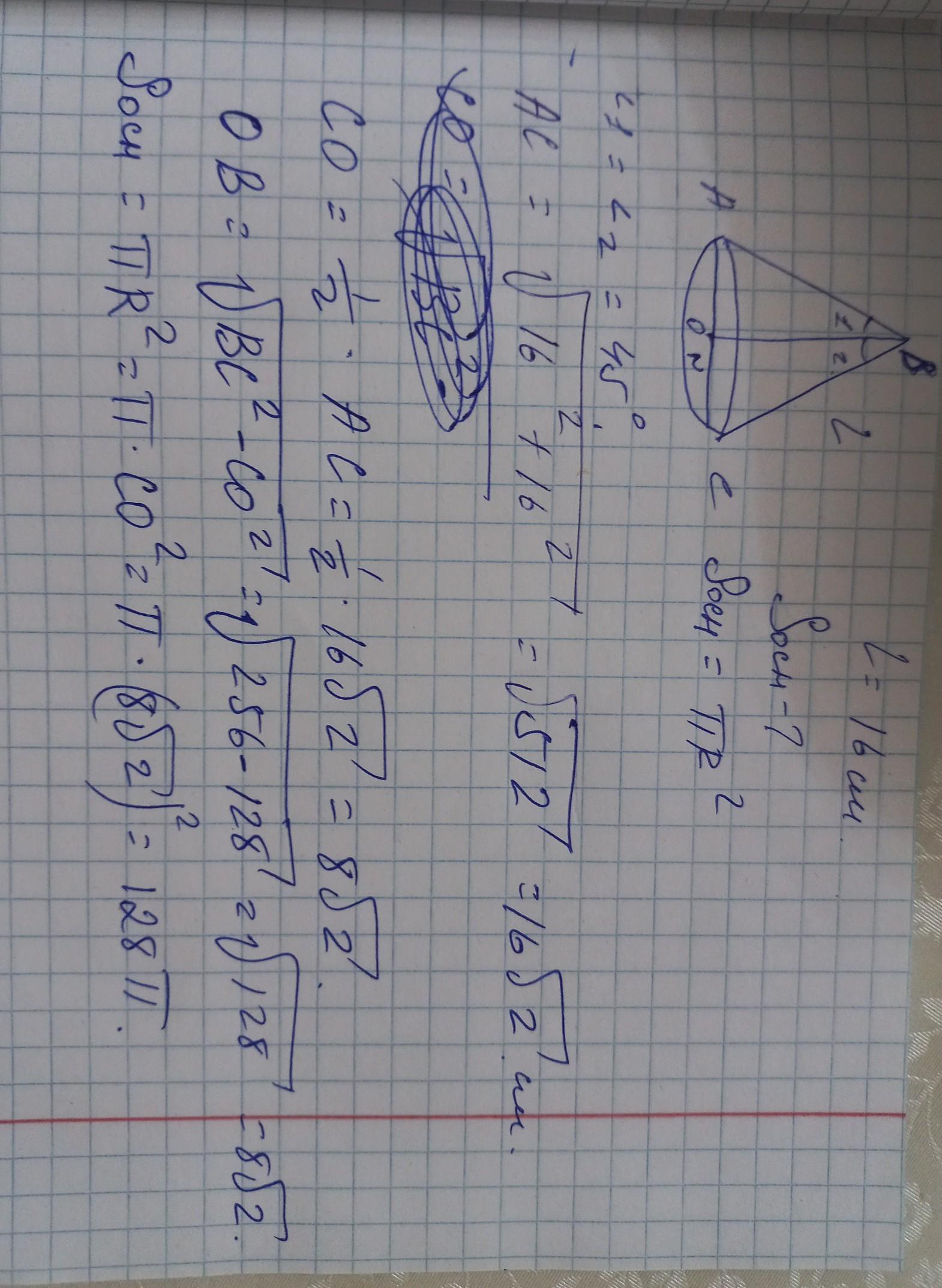 Найти площадь основания конуса, если его образующая равна 16 см, а угол при вершине осевого сечения равен 90°. Подробное решение пожалуйста