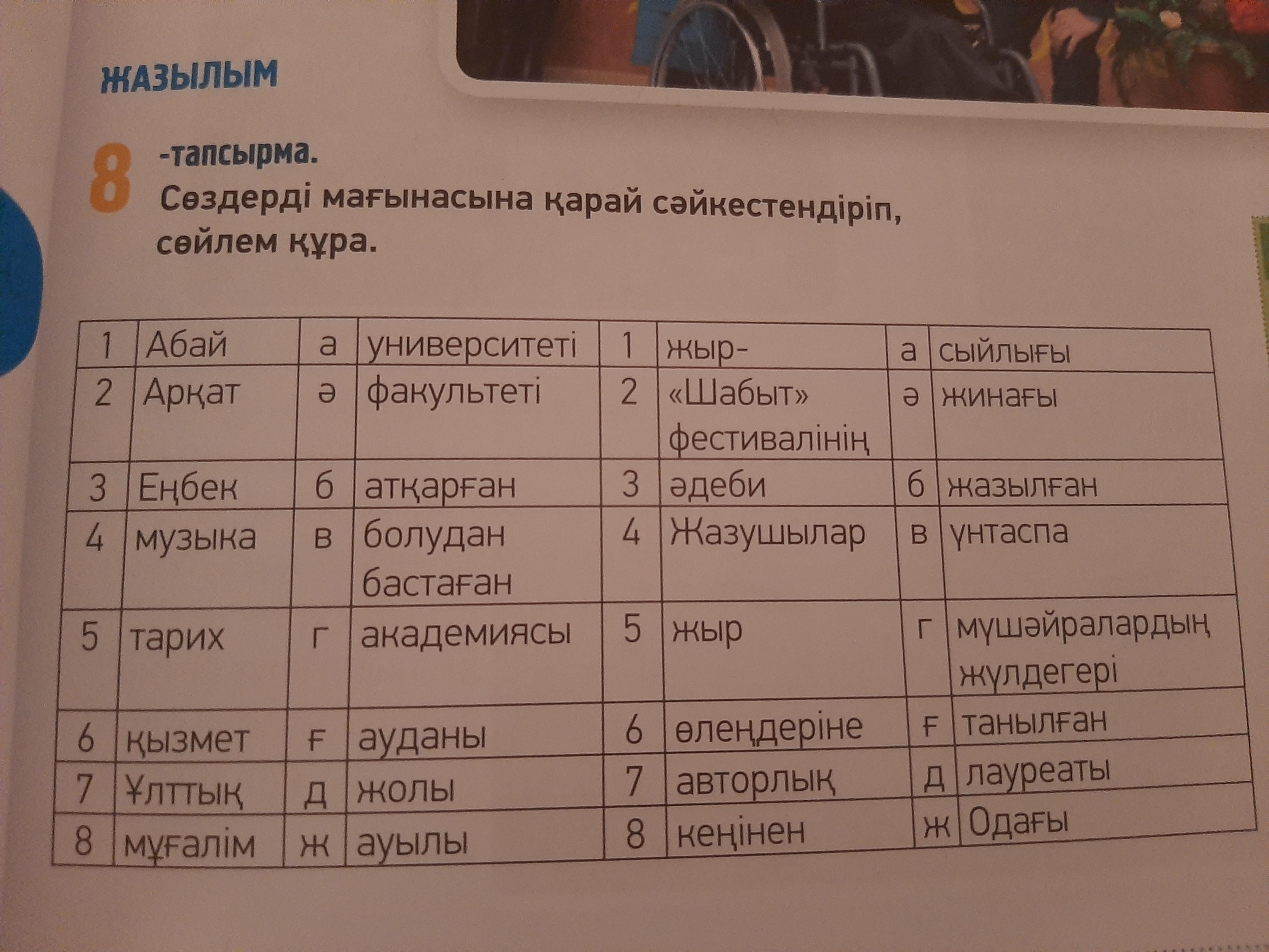 Сөздерді мағынасына қарай сәйкестендір. Сөйлем құра 8-тапсырма 39 бет пожалуйста помогите