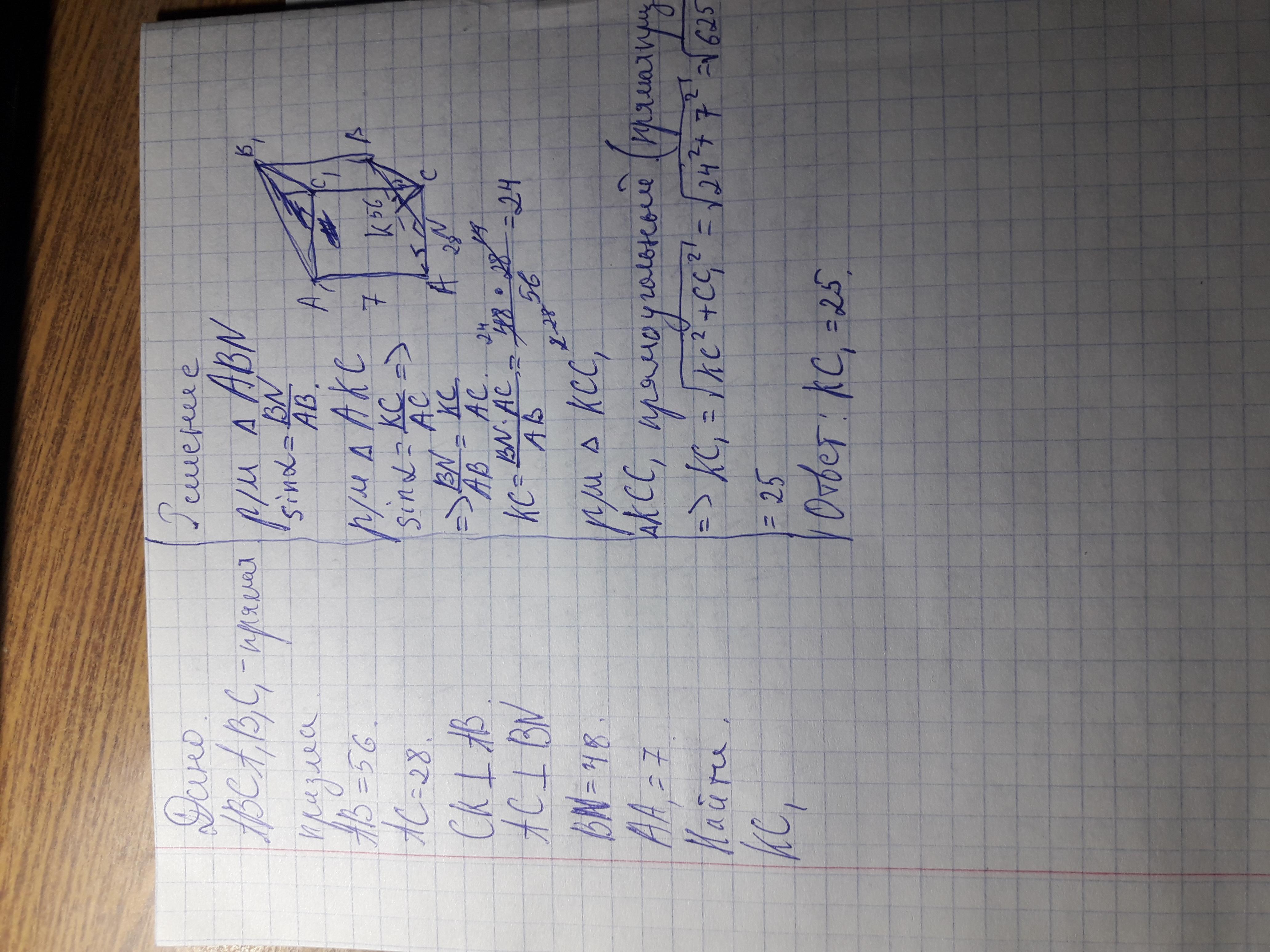 Дана прямая призма ABCA1B1C1. AB=56, AC=28. CK и BN - высоты, проведенные к сторонам AB и AC соответственно. BN = 48. Высота призмы равна 7. Найди длину отрезка KC1.
