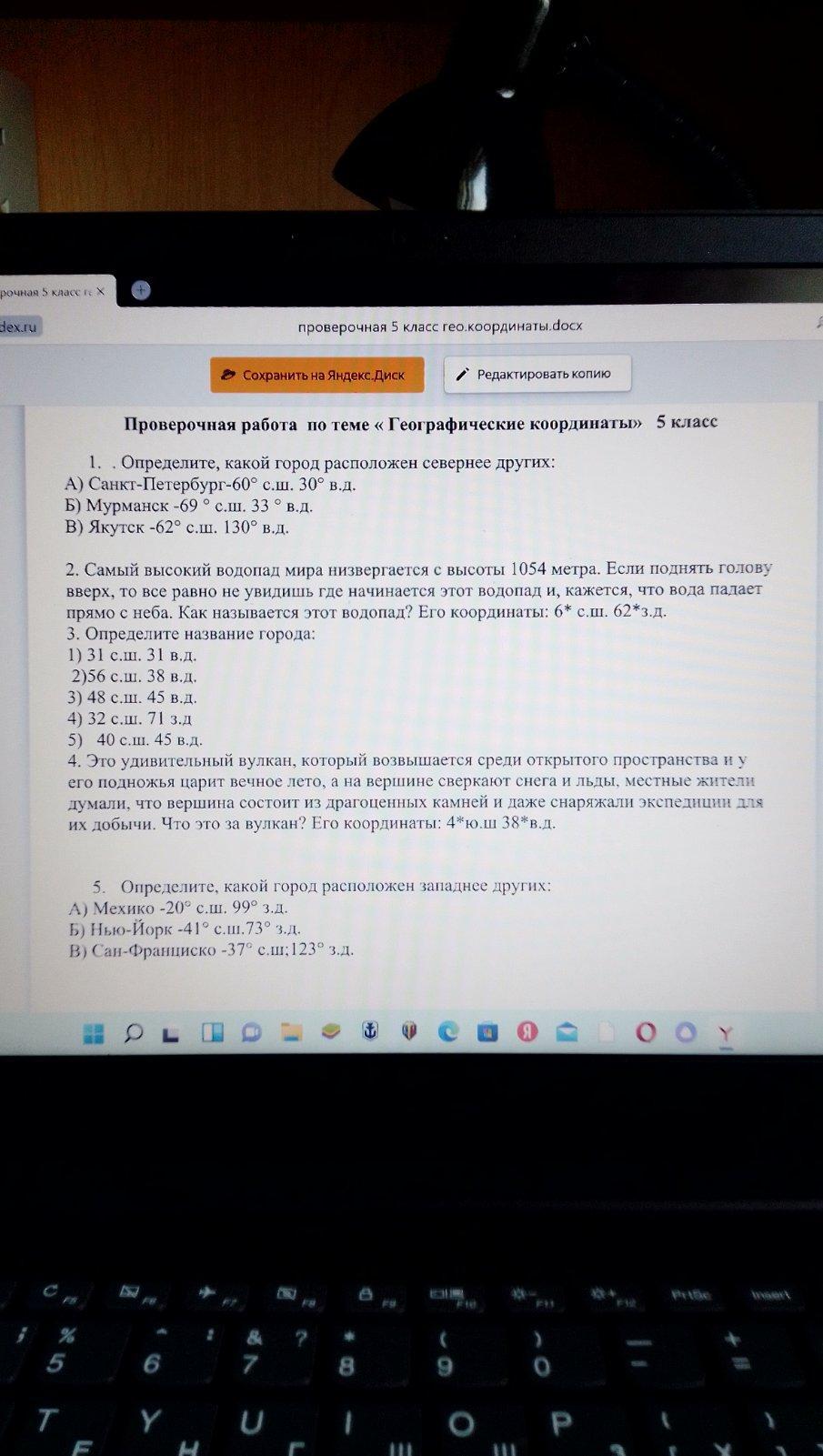 Ответ: 1. Якутск 2. Анхель 3. 1) Каир 2) Москва 3) Волгоград 4) Кильота 5) ? 4. Килиманджаро 5. Сан-Франциско