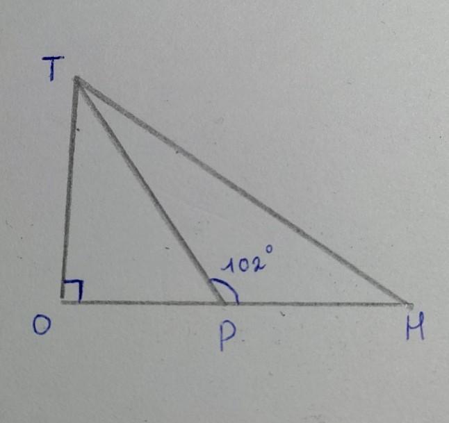 в прямоугольном треугольнике TOH ( угол O=90 градусов) проведена биссектриса TP.найдите острые углы треугольника TOH, если угол TPH=102 градуса.