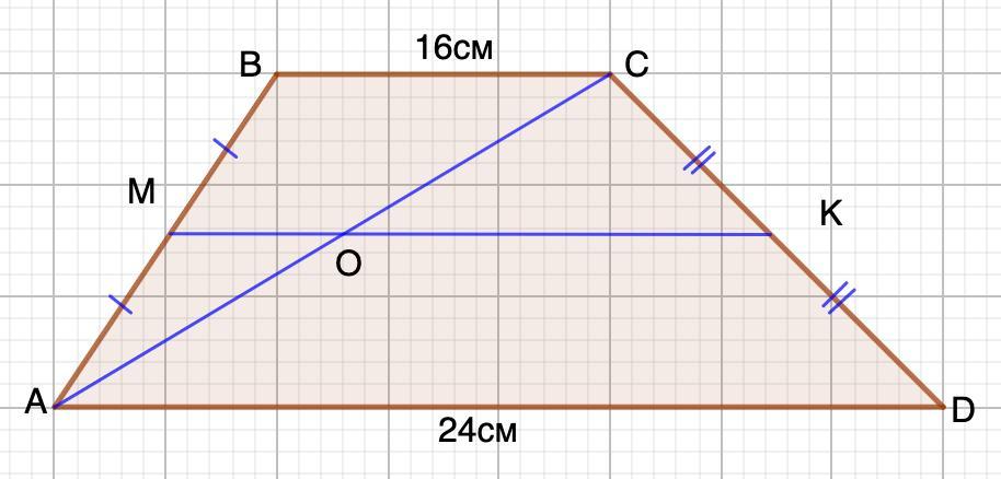 Диагональ, которая делит среднюю линию на два отрезка. Сколько