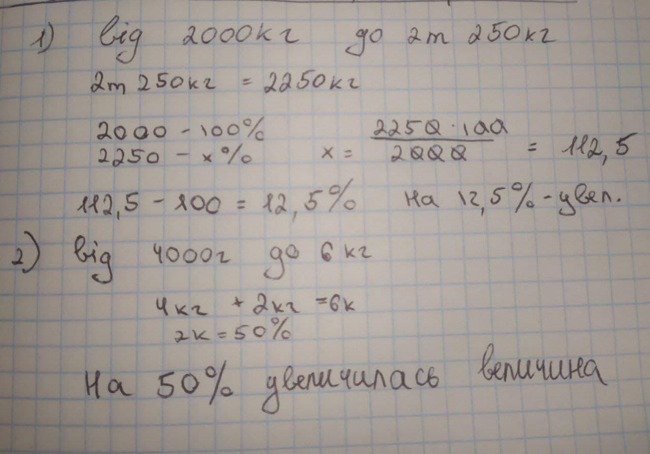 вирази у відсотках зміну величини 1) від 2000 кг до 2т 250 кг 2) від 4000м до 6 кг СРОЧНО!!!!!!