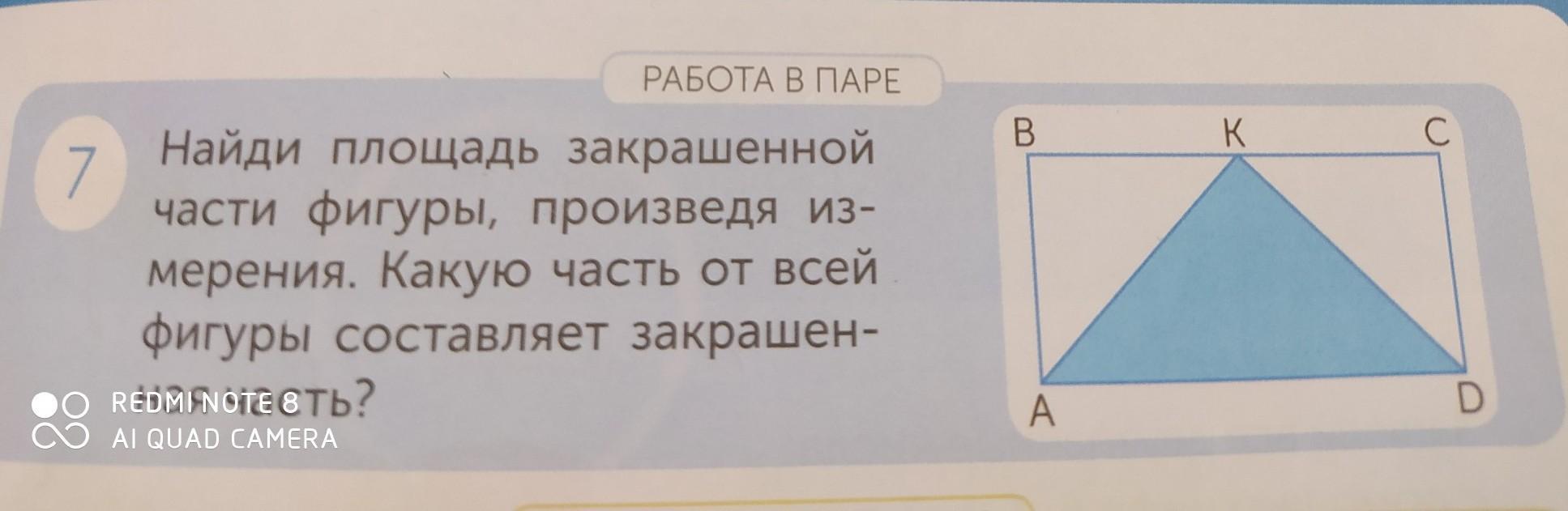 7 РАБОТА В ПАРЕ Найди площадь закрашенной части фигуры, произведя из- мерения. Какую часть от всей фигуры составляет закрашен- ная часть?