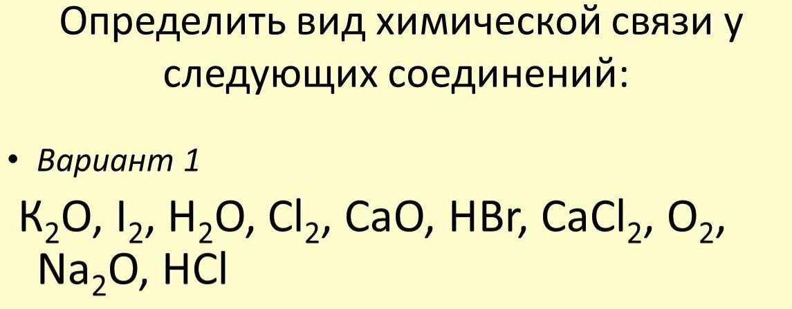 Ионная, ковалентная неполярная, ковалентная полярная, ковалентная неполярная, ионная, ковалентная полярная, ионная, ковалентная неполярная, ионная, ковалентная полярная.